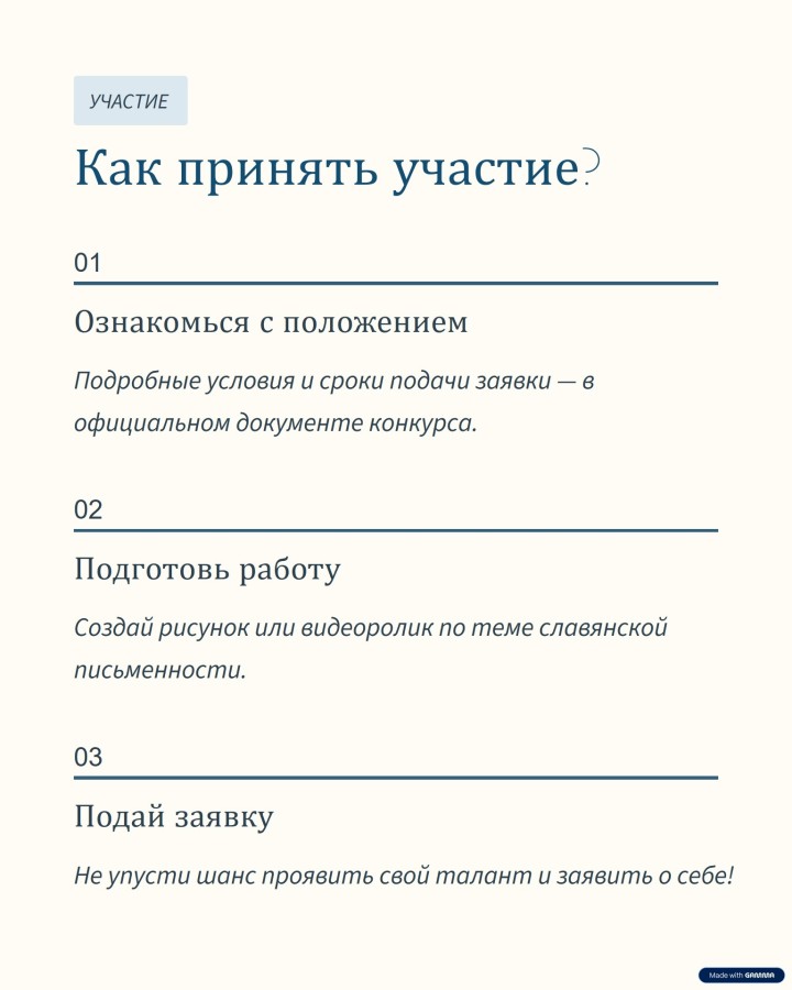 Заявки и конкурсные работы в номинации «Изобразительное искусство» принимаются с 29.04.2026 по 18.05.2026 по адресу: г. Абакан, ул. Павших Коммунаров, 100 (ЧОУ «Православная гимназия имени Святителя Иннокентия Московского»), заявки и конкурсные работы в номинации «Видеоролик» принимаются в электронной форме с 29.04.2026 по 18.05.2026 по адресу: pravgim2001@gmail.com Заявки и конкурсные работы, направленные позже 18.05.2026, не рассматриваются.
